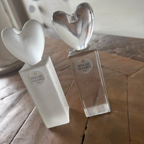 Sættet består af fire glas med hjerteformede propper. De er lavet af gennemsigtig glas og har en glat overflade. Stagerne er firkantede med en farvegradient fra klar til lyserød.,Afhentes i:,Røde Kors Ølby/Køge (259),Bemærk at mail, chat og beskeder ikke besvares, og varen skal købes på knappen "Gå til varen"