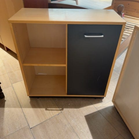 Møblet har en kombination af åbne hylder og et lukket skab. Materialet ser ud til at være træfiberplader med en glat overflade. Det har en moderne, minimalistisk stil og en håndtag i metal.,Afhentes i:,Røde Kors Kolding (621),Bemærk at mail, chat og beskeder ikke besvares, og varen skal købes på knappen "Gå til varen"