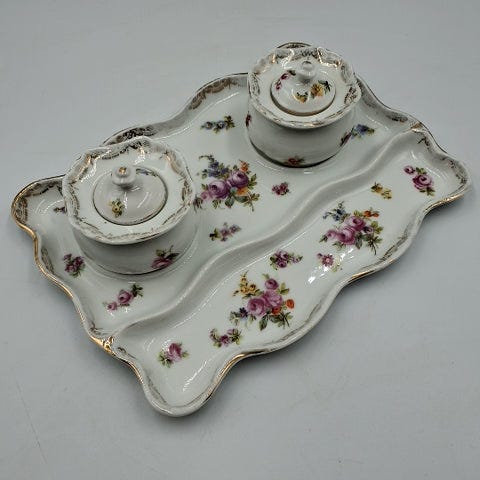 Produkten indeholder en række porcellænsgenstande med blomstermotiver og guldkant.,Afhentes i:,Røde Kors Kolding (621),Bemærk at mail, chat og beskeder ikke besvares, og varen skal købes på knappen "Gå til varen"