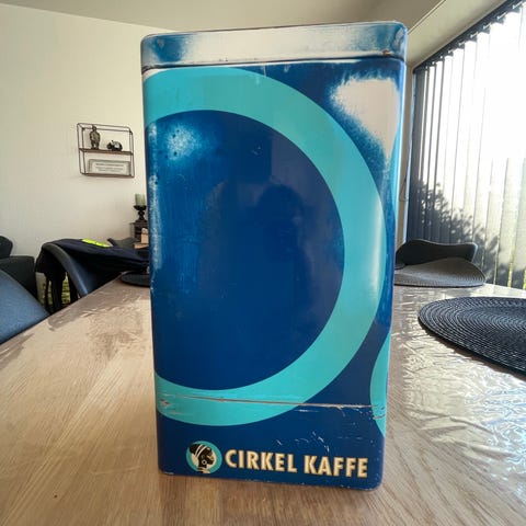 Retro kaffedåse fra Cirkelkaffe med patina. ,Afhentes i:,Røde Kors Bellinge (461),Bemærk at mail, chat og beskeder ikke besvares, og varen skal købes på knappen "Gå til varen"