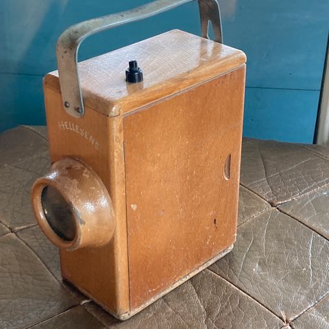 Lampen har en metallisk krop, en rund glasskærm og en bærerem af metal. Lampen virker ikke (muligvis kan batteriet dog skiftes, så den kommer til at virke). ,Afhentes i:,Røde Kors Bellinge (461),Bemærk at mail, chat og beskeder ikke besvares, og varen skal købes på knappen "Gå til varen"