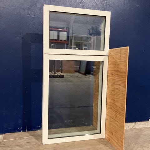Ubrugt Alvido Vinduesparti, træ/træ, topstyret/fastkarm, matteret, 2 lag glas, vinduet har lidt hakker, mål: H119 B64,9 D11,6 Varenummer: 1317