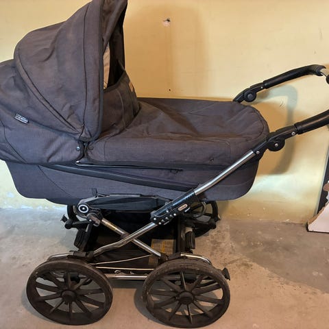 Barnevogn, Emmaljunga, Emmaljunga barnevogn m. drejehjul + lift + regnslag. Lidt misfarvning i liften og meget lidt rust på stel. Derfor den billige pris.
