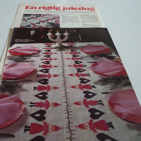 En side fra ugebladet Femina (Nr. 45 1989) med broderimønster / tælle diagram samt arbejdsgang til en juledug med fine snebær samt en bordløber med stjerner begge broderet i korssting.