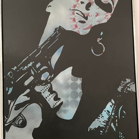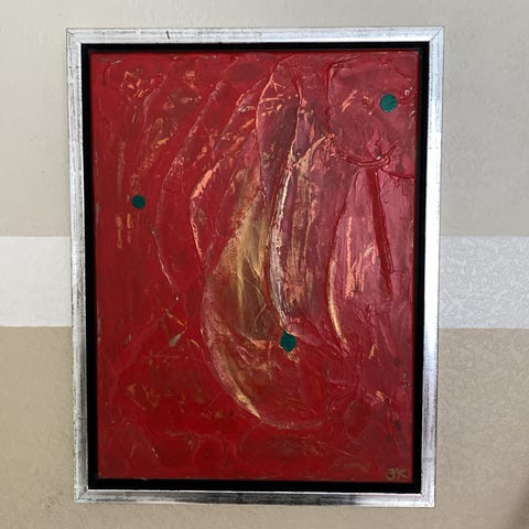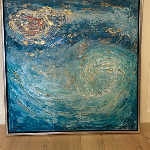 Akryl maleri i en kraftig struktur str 60x80 med antik sølvramme. Har flotteste kombination i farverne.