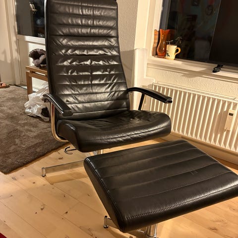 læsestol læderstol Aarhus hyggestol mancave cigarstol bibliotek kaffehjørne benene op på fodskammel tvstol i klassisk design highback chair classic skandinavisk / scandinavian nordisk / nordic design