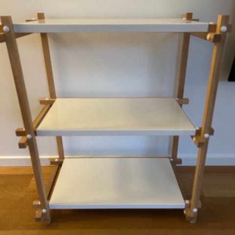 Reol i sæbebehandlet eg, med hvid lakerede hylder. Nypris kr. 3599,-
