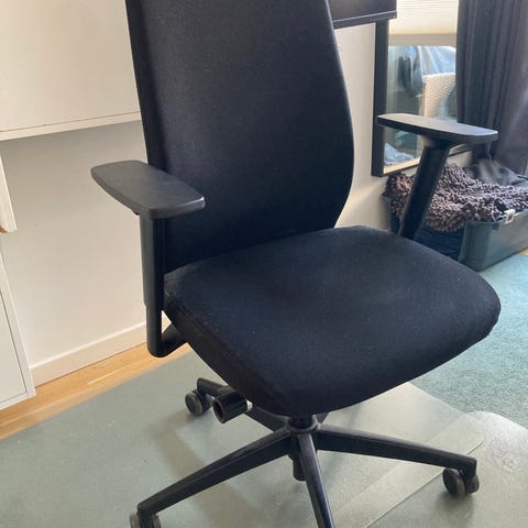 Har brugt stolen i ca. 8 år nu, men sælger fordi jeg trængte til noget nyt. Ryglæn følger fint kurven på min ryg, og har elsket at den ikke har armlæn, da jeg har kunnet side både sidelæns og med ben som jeg ville. Man føler sig fri.