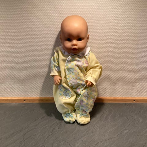 Rigtig pæn dukke med bevægelig hoved arme og ben og øjne der kan åbne og lukke, Har krøllet lyst hår, H. ca 30 cm.
