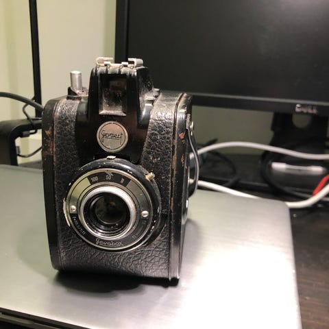 Foitzik Foinix 120 film 6x6 kamera med objektiv der folder ud når det åbnes. Kameraet er fra midt i 50erne. Kameraet er et arvestykke og jeg ved ikke om det fungerer. Belægningen på huset er lidt løsnet nogle steder og der er lidt mærker på den runde knap ovenpå. Jeg har forsøgt at tage billeder af det.