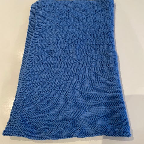 Blåt hæklet udltæppe i super blød kvalitet. Mål 66 cm * 89 cm (foldet 2 gange på billedet)