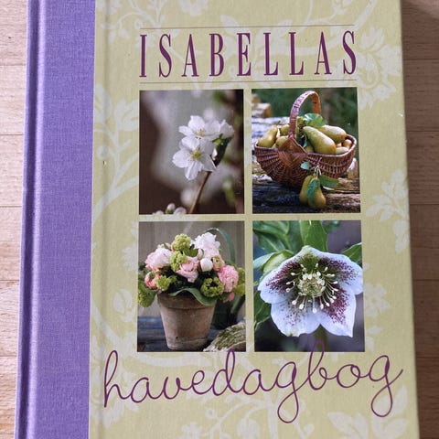 Isabellas Havedagbog havebog med illustrationer og plads til egne notater. Indeholder information om planter, havearbejde og blomster, samt håndskrevne sider til personlige observationer.