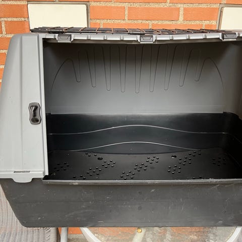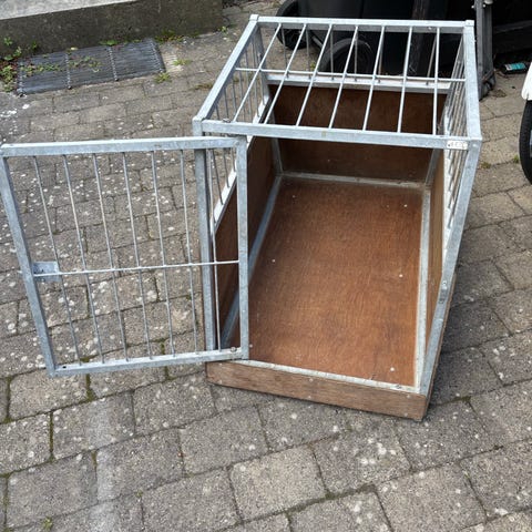 Praktisk hundebur med stor gitterskydelåge og sikkerhedslås. God ventilation og de indbyggede opbevaringsrum gør at man kan have alt det praktiske samlet samme sted.