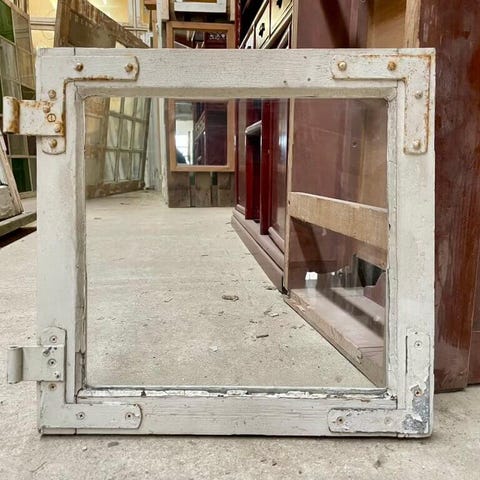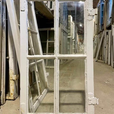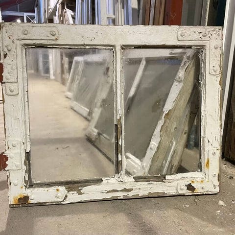 Fin, lille og original vinduesramme med to ruder og smal, lodret sprosse. Ruderne er kittet i. Sundt træværk samt stedvis afskallende maling samt kit med behov for små lapninger.