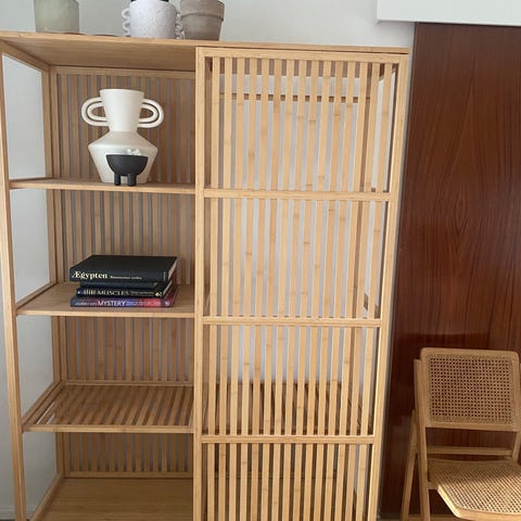 Bambus reol med fem hylder i naturlig farve. Reolen har et let og åbent design. Velegnet til opbevaring eller som dekorativ møbel i stue eller soveværelse. Reolen er købt i Manila huset i Glostrup.