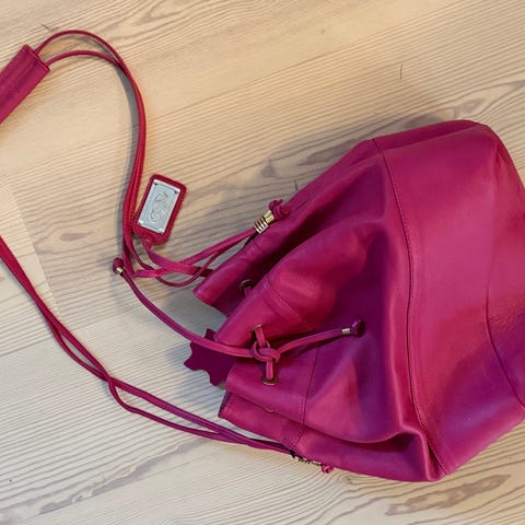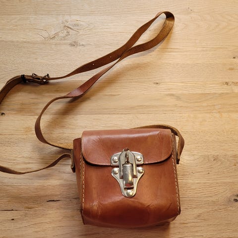 Lille sjov firkantet lædertaske (trænger til noget læderfedt). 12 x 12 x 7,5cm. Remmen er lang nok til crossbody, 130cm i yderste hul. Meget lidt brugt. Er som ny indeni. Mindre pæn skjult under klappen. Metallås. Vejer 160g.