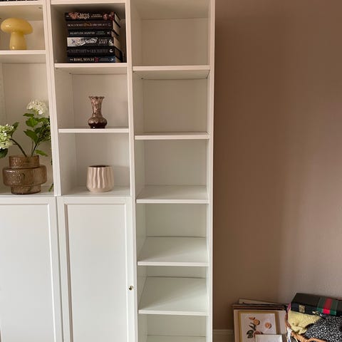 Reolen sælges med vitrinelåge, denne kan dog skrues af. Der er 3 flytbare hylder.