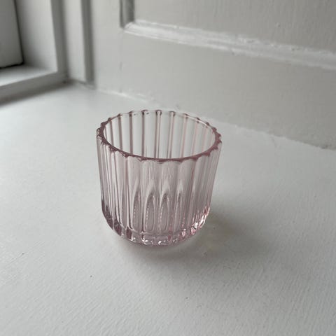 Den viste genstand er en Lyngby lysestage med en højde på 6,5 cm. Lysestagen er lavet af frostet glas og har en rillet overflade, der giver et elegant og moderne udseende. Den er beregnet til at bruges med et fyrfadslys.