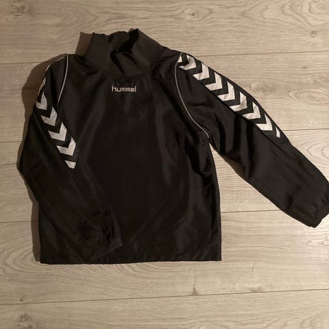 Sæt bestående af en trøje og et par træningsbukser i blå farve til børn. Trøjen har lange ærmer, ribkanter ved ærmerne og halsen, og en knaplukning ved skulderen. Fronten af trøjen viser et tryk med Hummel logo. Bukserne har en elastisk talje med snøre og logo tryk på det ene ben.
