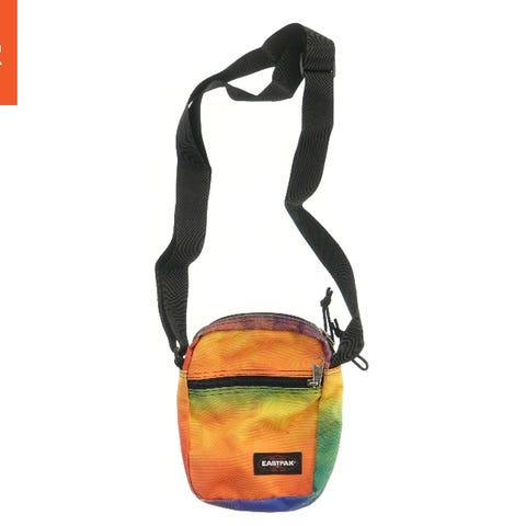 Skuldertaske fra Eastpak med et livligt, flerfarvet regnbue design, der blander orange, grøn, blå og lilla nuancer. Tasken har en justerbar sort skulderrem og en lynlåslukning med en frontlomme for nem opbevaring. Taskens størrelse er 24x20 cm, ideel til daglig brug. Logoet 'Eastpak' er tydeligt synligt på taskens front.