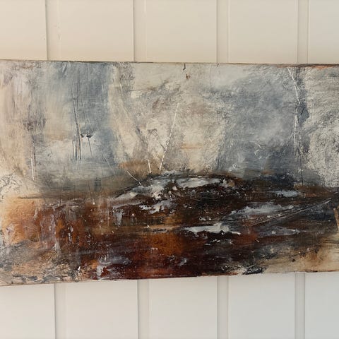 Originalt Yoon abstrakt maleri med mål på 83 x 124 cm inkl ramme. Maleriet er udført på lærred og indrammet med en enkel ramme. Farveskalaen består af neutrale toner som beige, brun og sort. Velegnet til vægdekoration i hjem eller kontor.
