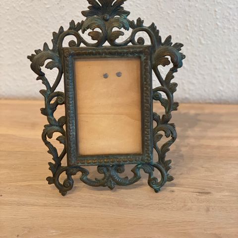 Hvis man er til jugendstil , så chek lige denne gamle billed ramme i bronce ud , den har de fineste mønstre , det er en bord model, bære pinden er der ikke mere , men der er en træ pind med, er med glas, mål 16 x 7,5 cm, der er en hår revne på den ene vinge , ( check billed ) , Søgeord ! Samler, samleobjekt , indbo, indretning . SENDER KUN MED DAO ELLER AFHENTNING .