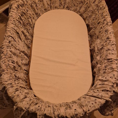 Retro vugge i kurveflet med hjul. Kan bruges til barnet er op til 6 måneder. Har været i familiens eje i flere generationer men skal nu videre. Er selvfølgelig brugt men udover lidt knirkende hjul fejler den ikke noget. Madras og indvendigt betræk er udskiftet for et halvt år siden.