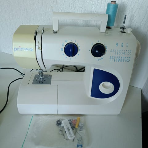 Primera FY812 Symaskine i hvid farve. Modellen FY812 er en elektrisk symaskine, der leveres med strømforsyning, brugervejledning og tilbehør som tråd og nåle. Maskinen er egnet til almindelig syning og har forskellige funktioner til tekstilarbejde. Produktet sælges med original emballage.