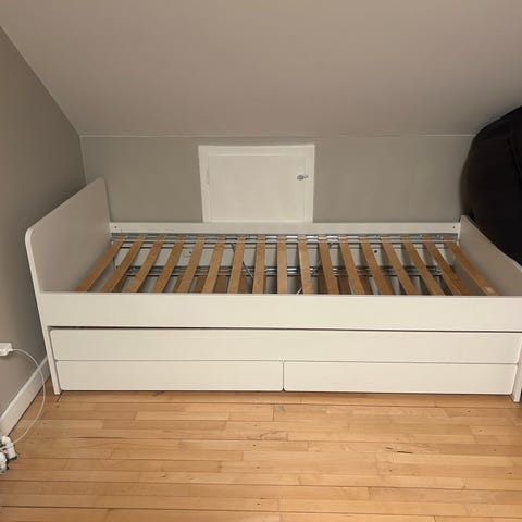 Slakt seng fra IKEA. Sælges med Moshult topmadras, Malvik madras og Tuddal madras i underskuffen. Der mangler en tværpind i metal og madrasserne er lidt nussede med enkelte pletter (betrækket kan vaskes). Seng ny pris ca 4000kr inklusiv madrasser. https://www.ikea.com/dk/da/p/slaekt-sengestel-med-underseng-opbevaring-hvid-s89227731/