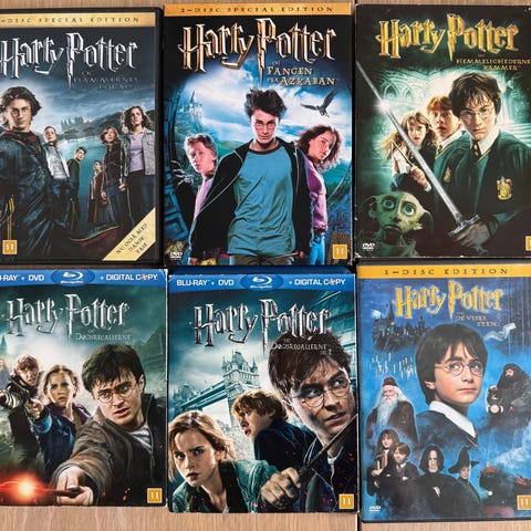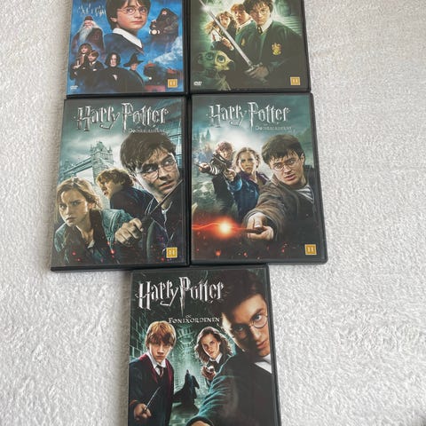 Harry Potter DVD box sæt indeholdende flere film i serien. DVD'erne er i standard størrelse og leveres i originale covere. Sættet indeholder film med forskellige coverdesigns og er beregnet til hjemmeunderholdning.