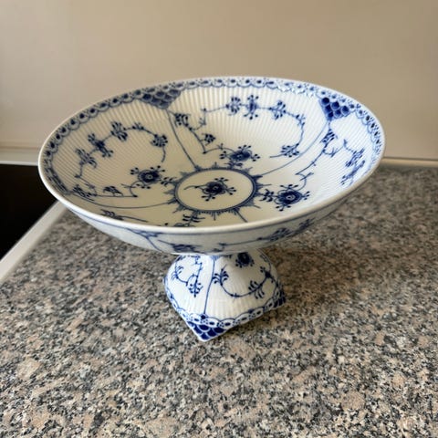 Royal Copenhagen Musselmalet firkantet skål 25 cm fra hjørne til hjørne, 6 cm høj. Perfekt stand dog med hak på foden som på billede. 1. Sortering. Meget gammel malet af maler nr 36