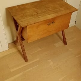 Sybord med tre skuffer og messing håndtag, måske nøddetræ og lakeret bordplade.
