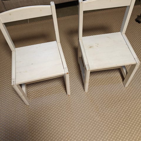 Charmerende håndlavede hvide børnestole med hjerteudskæring. Total højde 57 cm. Sædehøjde 30 cm. Bredde 31 cm.
