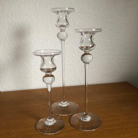 Holmegaard glas lysestager, sæt af 3 stk, fremstillet i klart glas. Lysestagerne har forskellig højde og klassisk design, velegnet til dekoration og brug til stearinlys.
