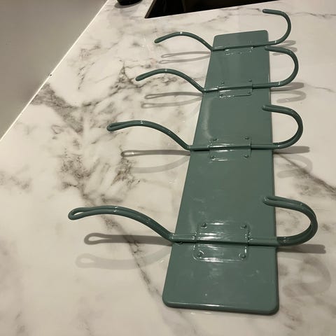 Hjemmemalet knagerække i mintgrøn, købt i Trævarefabrikkernes Udsalg. Længde: 60 cm, højde: 10 cm