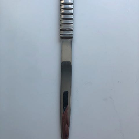 Brevåbner i metal med Christian d 10 monogram , bladet viser tegn på brug og slid. Brevåbneren er velegnet til åbning af konvolutter og mindre pakker.