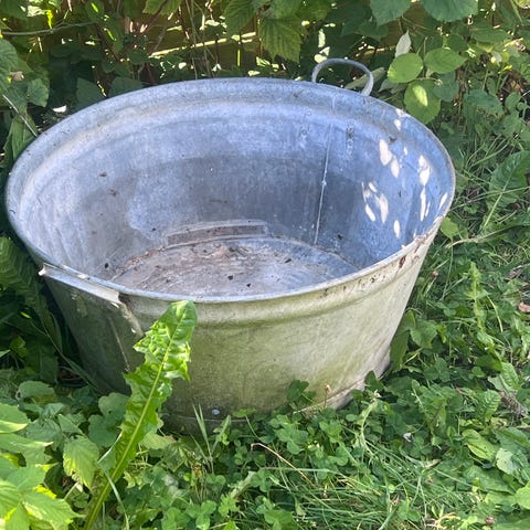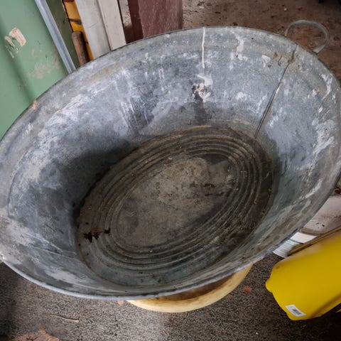 Stor zinkbalje. Brugt til at samle vand i og skulle fødder i inden badebassinet. Er lidt bøjet i kanten af bunden på den ene side.