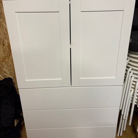 Platsa skab med kurve og bøjlestang sælges. Købt juli, samlet start september. Skabet passer ikke til behovet og sælges derfor igen. Det er ikke brugt til andet end to jakker og et par sko. Der er ikke engang nået at blive monteret håndtag på lågerne - som medfølger selvfølgelig.