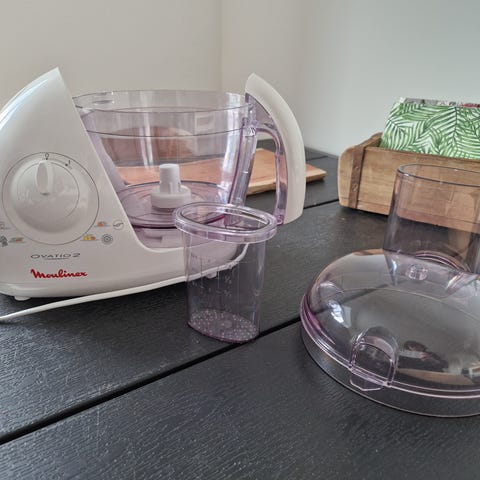 Foodprocessor der kan piske/mikse, rive/snitte, hakke, citruspresse, ælte/røre.