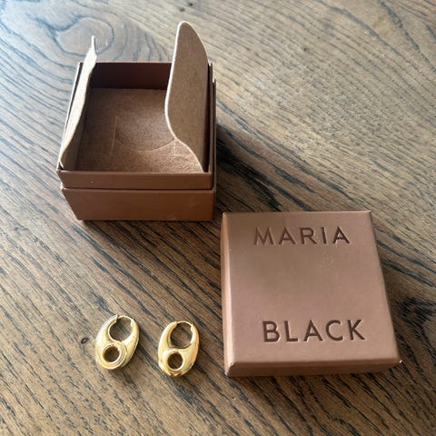 3 sæt øreringe af Maria Black. Stort set ikke brugt, fremstår som nye. Det ene par er forgyldt, alle 3 stemplet 925 sterlingsølv og ‘Black’. Kommer i original æske