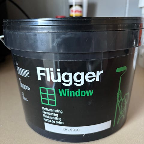 Sælger denne 3 liters flügger vinduesmaling i farven råhvid som er standard farve.