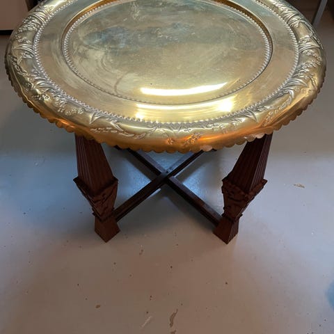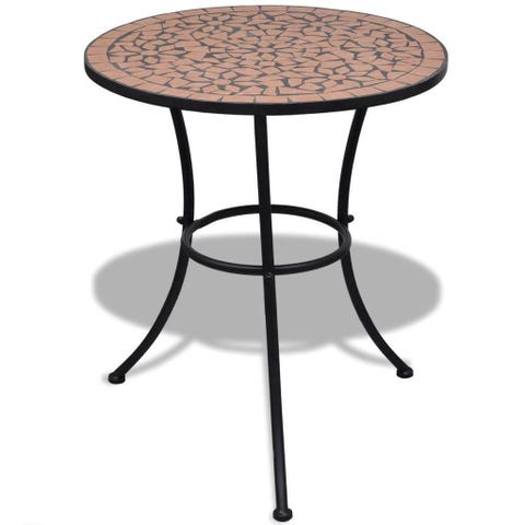 Bord med rund mosaikbordplade og foldbart metalstel. Bordpladen har en farve i beige og lyse nuancer med et mønster af mosaiksten. Bordet har en højde og størrelse, der gør det velegnet til både mindre og større rum eller som sidebord.