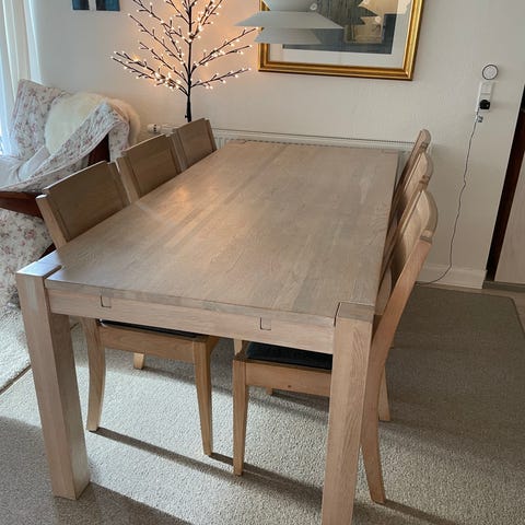Robust egetræsbord med 6 stole og 2 extra plader på hver 40cm. Pladerne kan indsættes enkeltvis. Totallængde med begge plader 290.