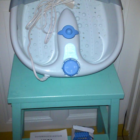 Linea fodbad med massagefunktion i hvid og blå farve. Enheden er designet til fodpleje med indbyggede massagehjul og justerbar temperaturkontrol. Fremstillet i plastmateriale med skridsikre fødder for stabilitet under brug.