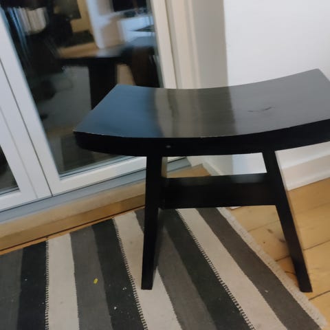 Gammel autentisk kinesisk skammel i træ med strimlet linnedsæde. Skamlen kan foldes sammen og er 27 cm høj, og sædet måler 23x28 cm. Skamlen sælges for 275 kr., som betales kontant eller via MobilePay ved afhentning fra adresse.