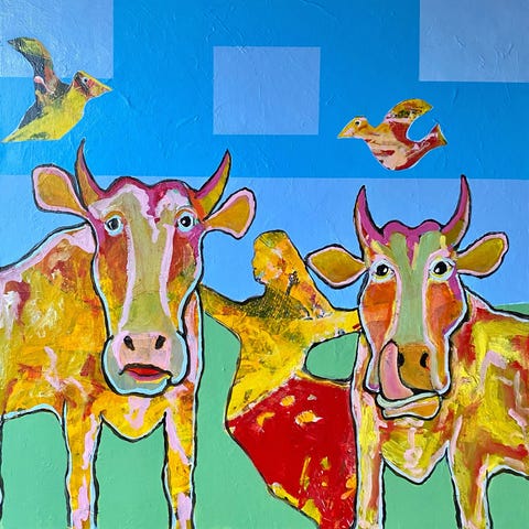Maleri på lærred med motiv af ænder og flyvende fugle i naturmiljø. Maleriet har en tekstureret overflade og viser detaljeret brug af farver som grøn, brun, sort og hvid. Kan anvendes som vægdekoration.