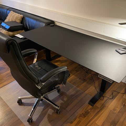 Hævesænke skriveborde 2 stk med sort bordplade og sort stel, mål 160x80 cm. Bordet har kabelføringshuller og justerbar højde. Velegnet til kontorbrug eller hjemmekontor- samt 2 stk. læder kontorstole (den ene mangler et hjul) - sælges pga flytning. Lamper med følger ikke. 3.500 kr pr stk bord inkl pr stk stol - samlet pris for 2 borde og 2 stole sælges for 5.800 kr. - skal fragtes i stor bil eller trailer.