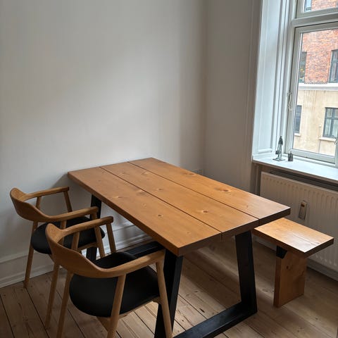 Kom med et bud ☺️ Vi sælger vores fine plankebord inkl. bænk. Prisen er angivet inkl. de to stole (købt i ILVA i 2021). Både bord, bænk og stole har brugsspor, men det er nærmest kun synligt i det rette lys og ved nærmere inspektion. Plankebordet og -bænken kan formentlig slibes ned og lakeres/olieres, hvis skrammerne er for meget :) Bordets to ben kan skrues af. Skal løftes ned fra en 1. sal.