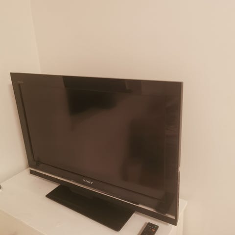 Sony TV med tilhørende vægbeslag og fjernbetjening. TV'et har en sort ramme og skærm, og vægbeslaget er hvidt med justerbare arme til montering på væg. Fjernbetjeningen er inkluderet.