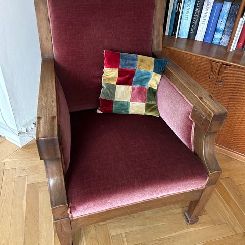 Alderen taget i betragtning- så er det i super god stand/ passet rigtig godt på. Passer perfekt i en lejlighed hvor det kan fungerer som skrivebord (skuffe til pc’er mv) og som spisebord. Det fylder kun 100 cm når begge klapplader er slået ned. Rigtig god siddekomfort i stolen - alle stabile og med fin polstring. Træsort muligvis mahogni.